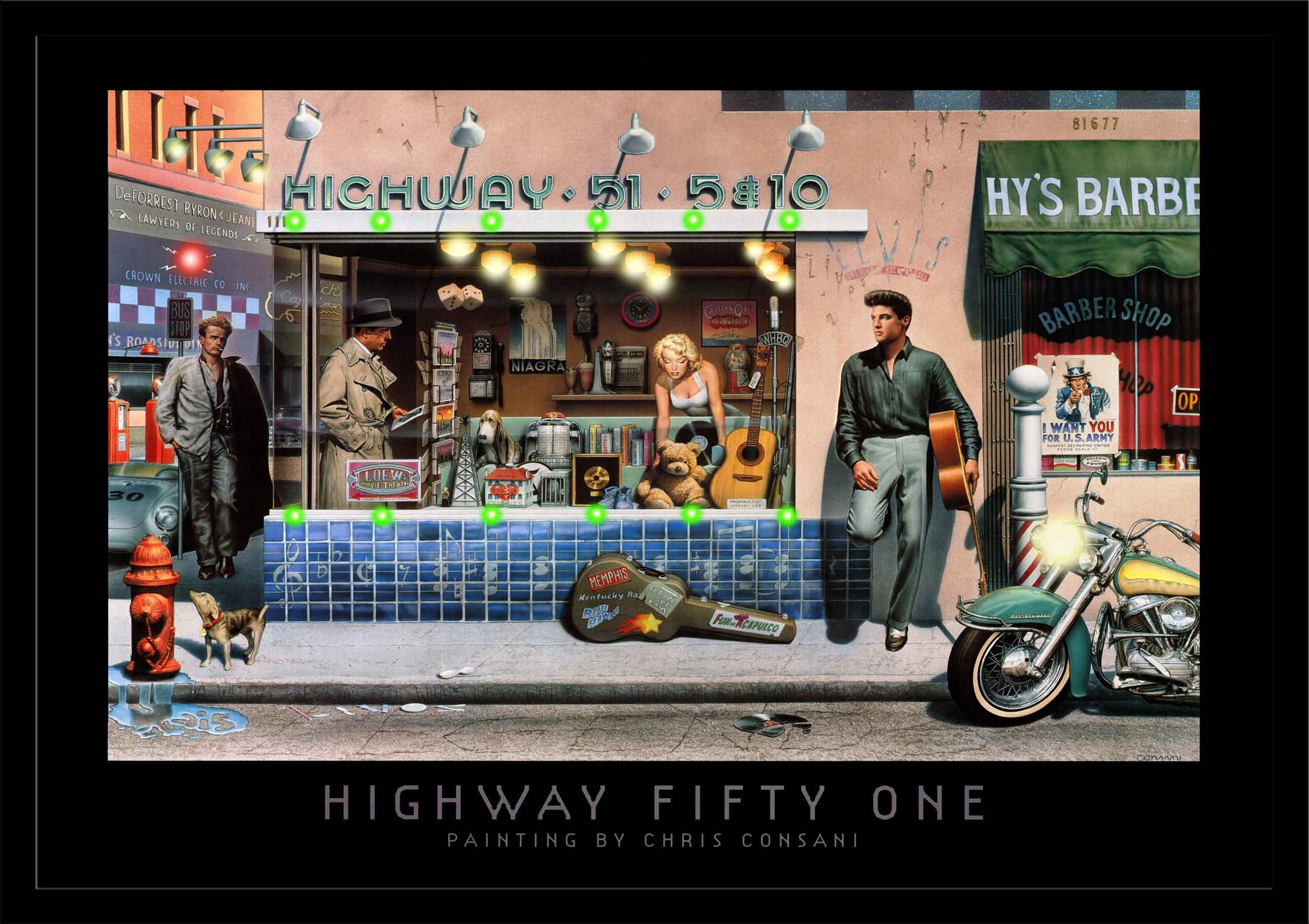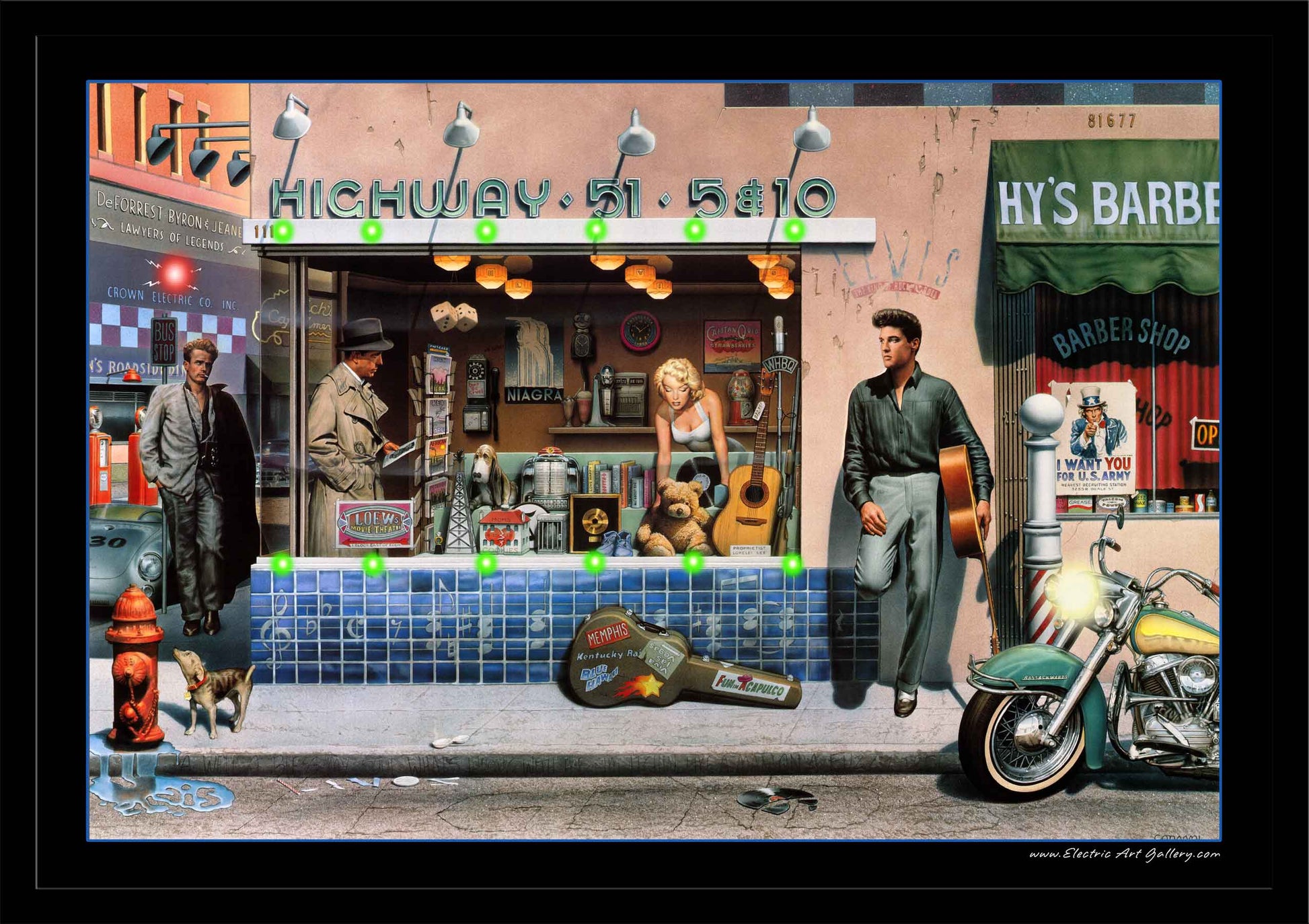 Another fantasy rendering by popular artist Chris Consani - featuring Elvis James Dean, Bogie and Marilyn Monroe. Another artwork in the popular series by artist Chris Consani. Mini Light Bulb in motorcycle headlight. Yellow, Red & Green L.E.D.s decorate bldgs.