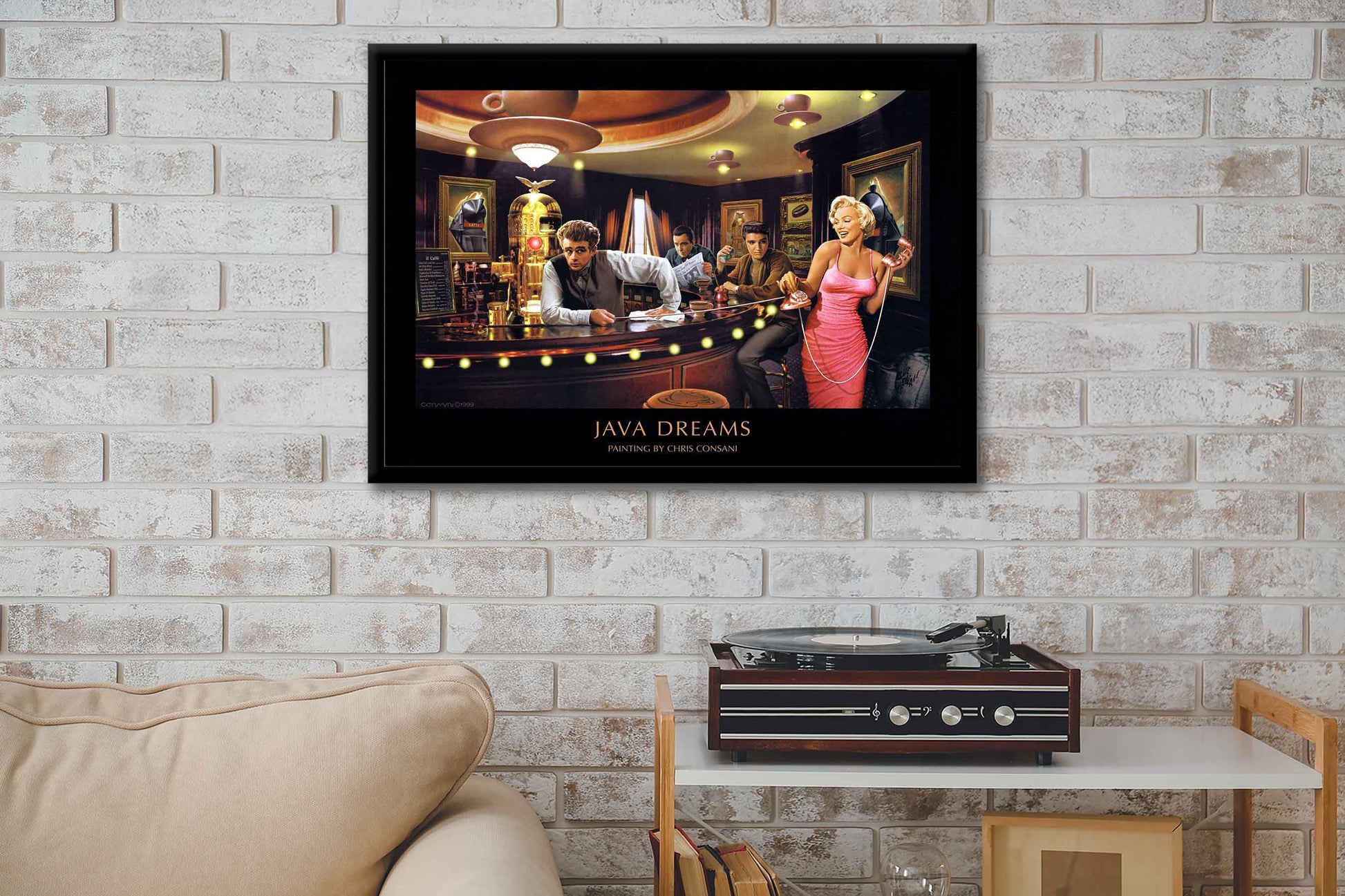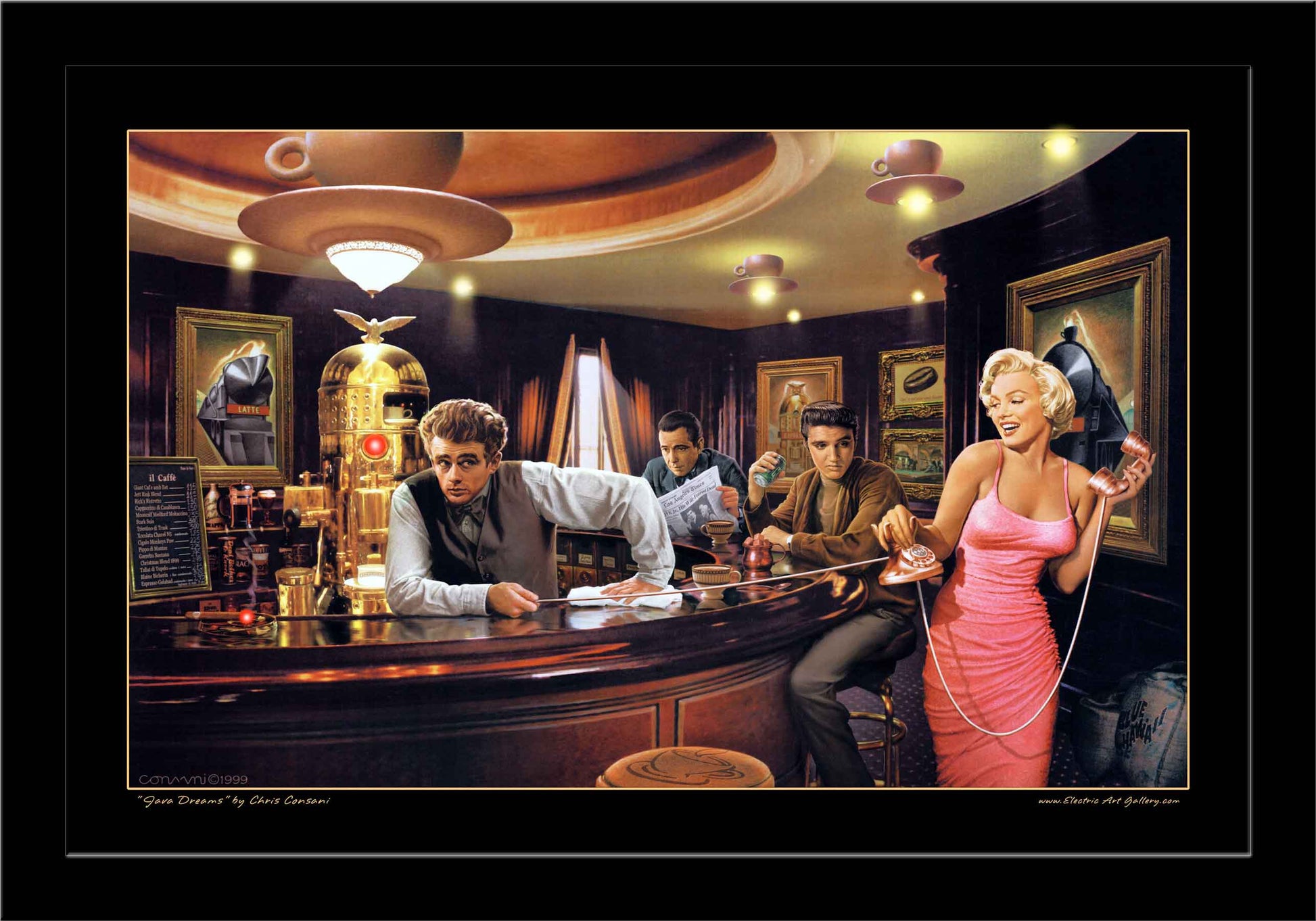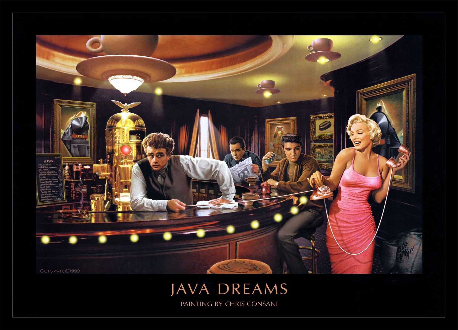 Elvis, Marilyn, Bogie & Dean share a playful evening and a cup of 'Joe'. Yellow L.E.D. lights in ceiling lights, Red L.E.D. lights in coffee machine and tip of cigar.