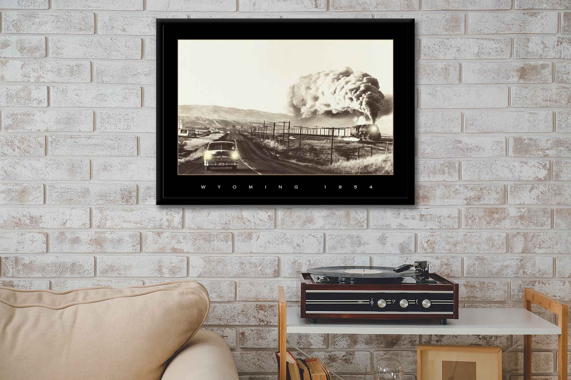 Classic Black & White Scene from the rear view window of a car in rural Wyoming, 1954. Framed artwork with special lighting effects from Electric Art. Mini Light Bulbs in car headlights and Train.